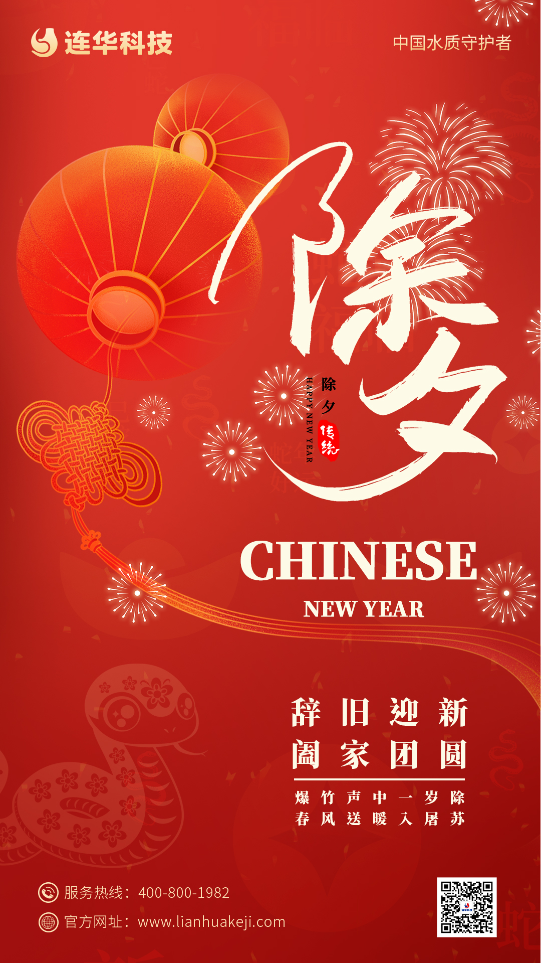 舊歲的余暉 漸漸隱沒于時光的幕后 新的一年 攜著新生的憧憬與希冀翩然而至 除夕佳節(jié) 連華科技全體員工恭祝大家 蛇來運轉(zhuǎn)巳巳好 心想事成步步高 家庭幸福美滿 生活平安喜樂